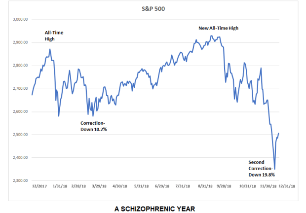 The year started optimistically with an expectation of continued synchronized global growth, benefits of U.S. tax cuts, and a forecast for 20% earnings growth. Based on these optimistic assumptions, the markets shot up to an all-time high in January, then plunged in February, then set a new all-time high record in September, then cratered by Christmas Eve and then finished with a modest, belated year-end Santa Claus rally. The year looked schizophrenic and December was the worst December since 1931. The wild seesaw swings makes one wonder if the so-called investment pros have convictions that last longer than 10 minutes. Through it all, it is hard to believe that the S&P 500 total return was only down -4.38%.
