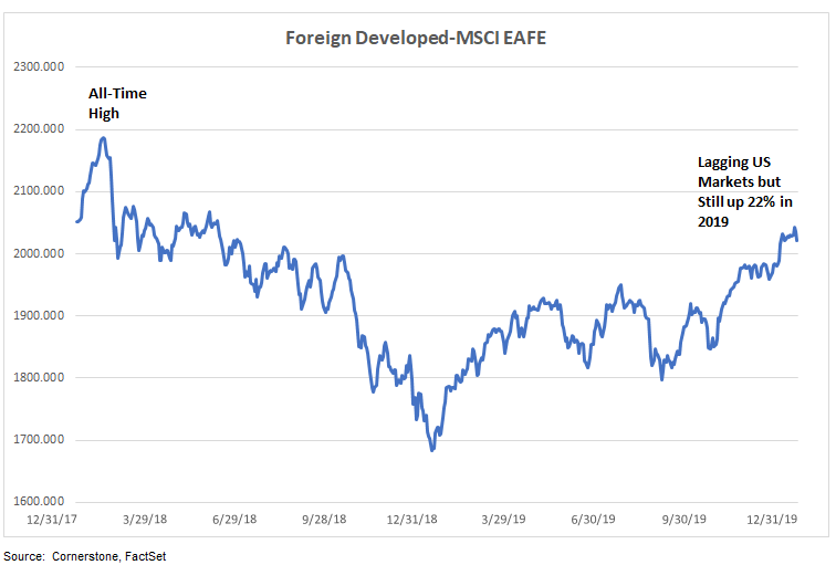 Foreign developed markets stocks hit their all-time-high of 2,186.65 on January 25, 2018, well in advance of record high levels for the U.S. stock market. Although foreign stocks trailed U.S. stocks, gains were still respectable at 22% for the broad developed market MSCI EAFE index. The European STOXX 600 index was up 23.2% and the Japanese Nikkei 225 index was up 18.2%.