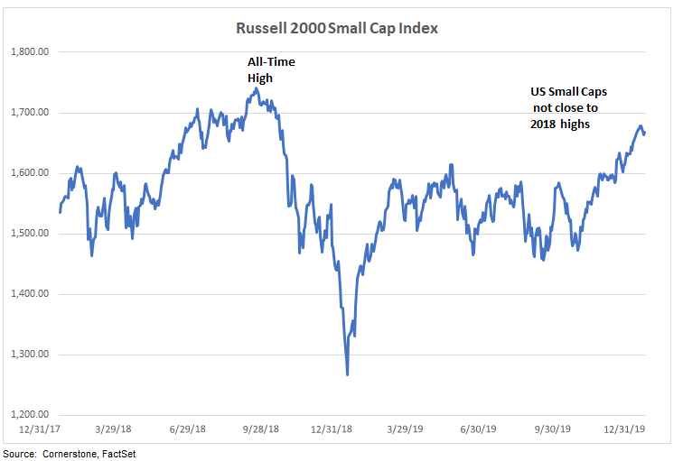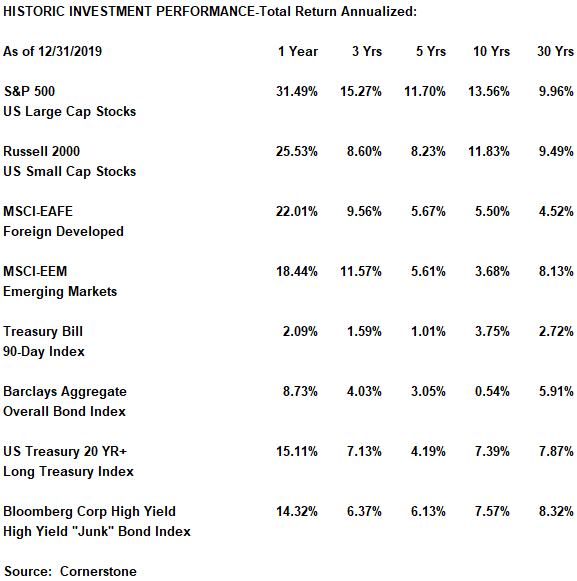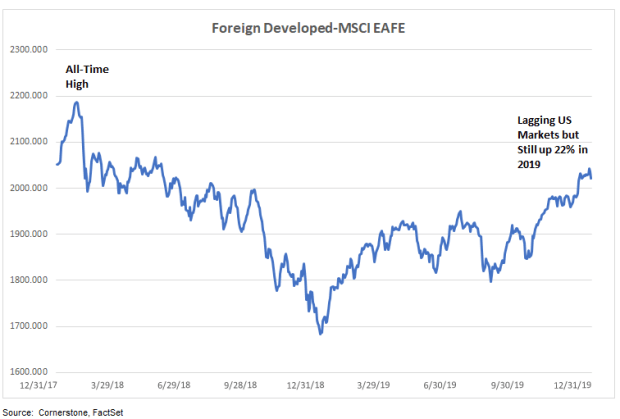 US small capitalization stocks have trailed US big caps in the recent past, but the Russell 2000 Small Cap Index still advanced a very respectable 25.5% for 2019. Although small caps have trailed large caps in recent years, small caps still have higher performance over the time of their long-term history.