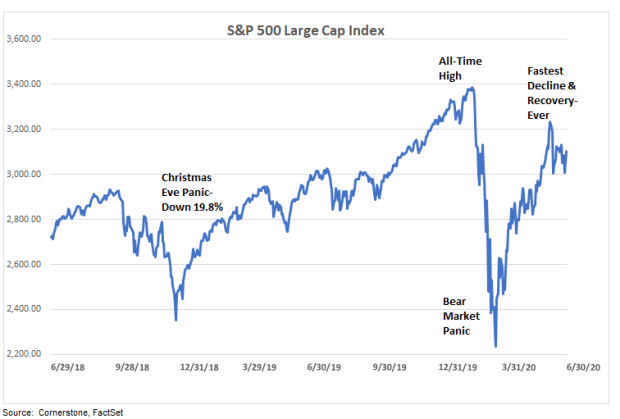 While recent economic statistics have been stronger than expected, they may reflect more pent-up demand rather than long-term growth. Economic growth over the next year faces significant headwinds and is not likely to quickly recover lost output. The economic recovery still looks like a “Nike Swoosh” or even a U-shaped recovery, not V-shaped, and it looks like there is a disconnect between the recent market rebound and the broader economic landscape. Although the market was up in the second quarter, it still looks vulnerable to additional sell-offs. The current situation seems to be the opposite of what happened in December 2018. At that time, the market sold off hard based on fears of a global economic recession, even though the economic data did not show an imminent recession. In January, 2019, Cornerstone described a Market/Economic Disconnect where economic fundamentals in late 2018 were much stronger than indicated by the sharp market decline. This time, however, the economic fundamentals are very weak, but the market has been ignoring these weak fundamentals as it rebounded significantly in April through June. Only time will tell how the coronavirus recession plays out, but it is helpful to stay grounded in longer-term economic and market fundamentals.