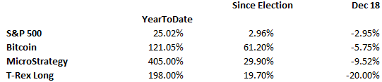 The table shows performance and volatility for year-to-date, since the election, and also the one-day move when the Fed disappointed the market. As the table shows, T-Rex Long fell -20.0% on December 18.