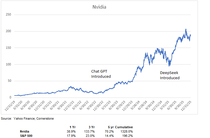 -Despite Nvidia’s impressive run, its 2025 39% gain lagged:  Broadcom: +51%, Alphabet: +64%, AMD: +78%, Micron Technology: +239% and SanDisk: +577% (leading the S&P 500).