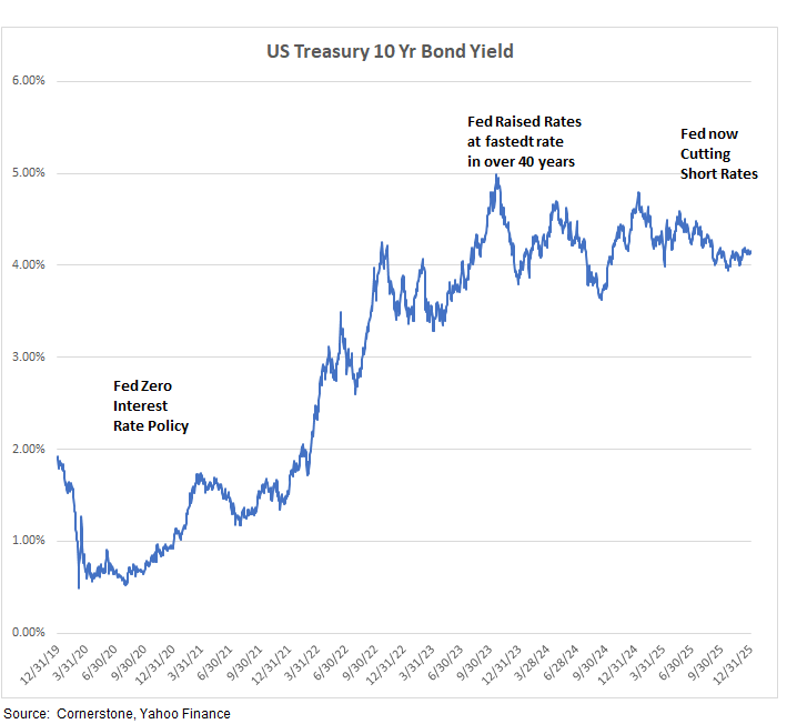 The 10-year US Treasury bond began 2021 with a 0.92% yield and ended the year at 1.51%. The rising interest rate environment caused 10-year Treasury Bond price to decline and cause negative total return performance. At this time, real yields (nominal yield net inflation) continue to be negative. Fed policy is to raise short-term rates on securities like the 90-day Treasury Bills, probably starting in mid-year 2022. On the positive side, high-yield corporate bonds generated a 5.3% total return. These high yield bonds have higher yields and shorter maturities that are less impacted by rising interest rates. Looking forward, longer-maturity bonds are expected to face higher interest rates that will further erode their bond price and result in another year of negative total return performance. Since the economy remains strong, high-quality and high-yield corporate bonds again look poised to generate positive returns.